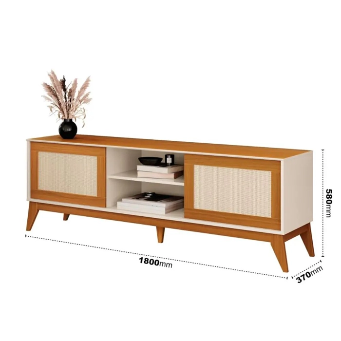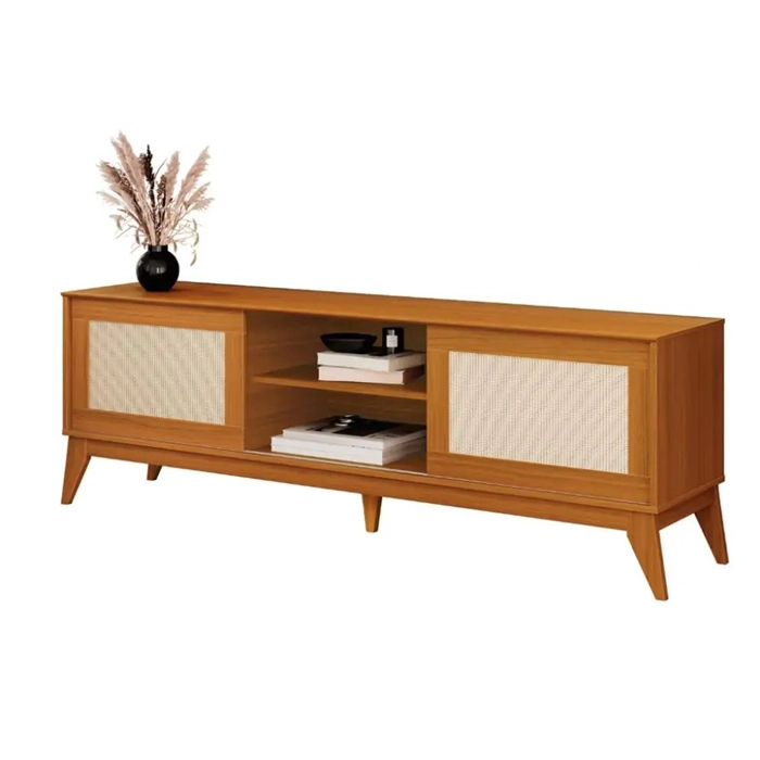 Transforme o seu espaço de entretenimento com o Rack Andros para TVs de até 65 polegadas. Fabricado com uma estrutura em MDP de 15 mm, o tampo em MDF de 12 mm, com borda laqueada, confere um acabamento refinado e elegante, complementando perfeitamente a decoração do ambiente. As portas deslizantes, equipadas com acabamento em tela Rathan sintético e moldura, garantem um toque de modernidade, além de oferecerem praticidade no acesso aos compartimentos internos.